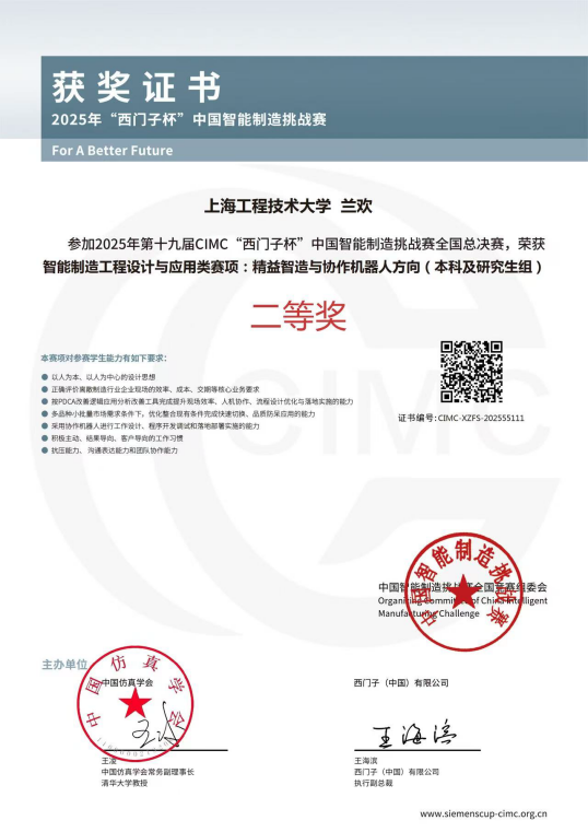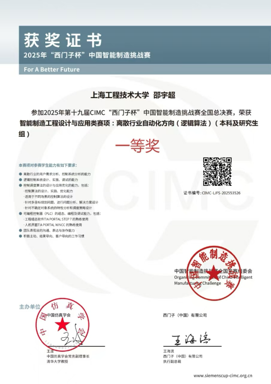 本次赛事受到学校和bwin必赢(以下简称电院)领导的高度重视,在电院相关教师的指导下,学院共有3支队伍获得晋级全国总决赛资格。由周顺、徐冬梅等老师指导,邵宇超同学组成的“只有红茶可以么”队和兰欢、谢胡羿、俞佳妮同学组成的“犇犇队”,经过多轮竞争,分别在离散行业自动化(逻辑算法)和精益制造与协作机器人两大赛项上获得全国总决赛一等奖和二等奖的优异成绩。至此,在2025年第十九届“西门子杯”中国智能制造挑战赛中,电院老师指导学生获得全国总决赛一等奖和二等奖2项,华东赛区特等奖5项,一等奖4项,二等奖21项,三等奖15项的优异成绩。
