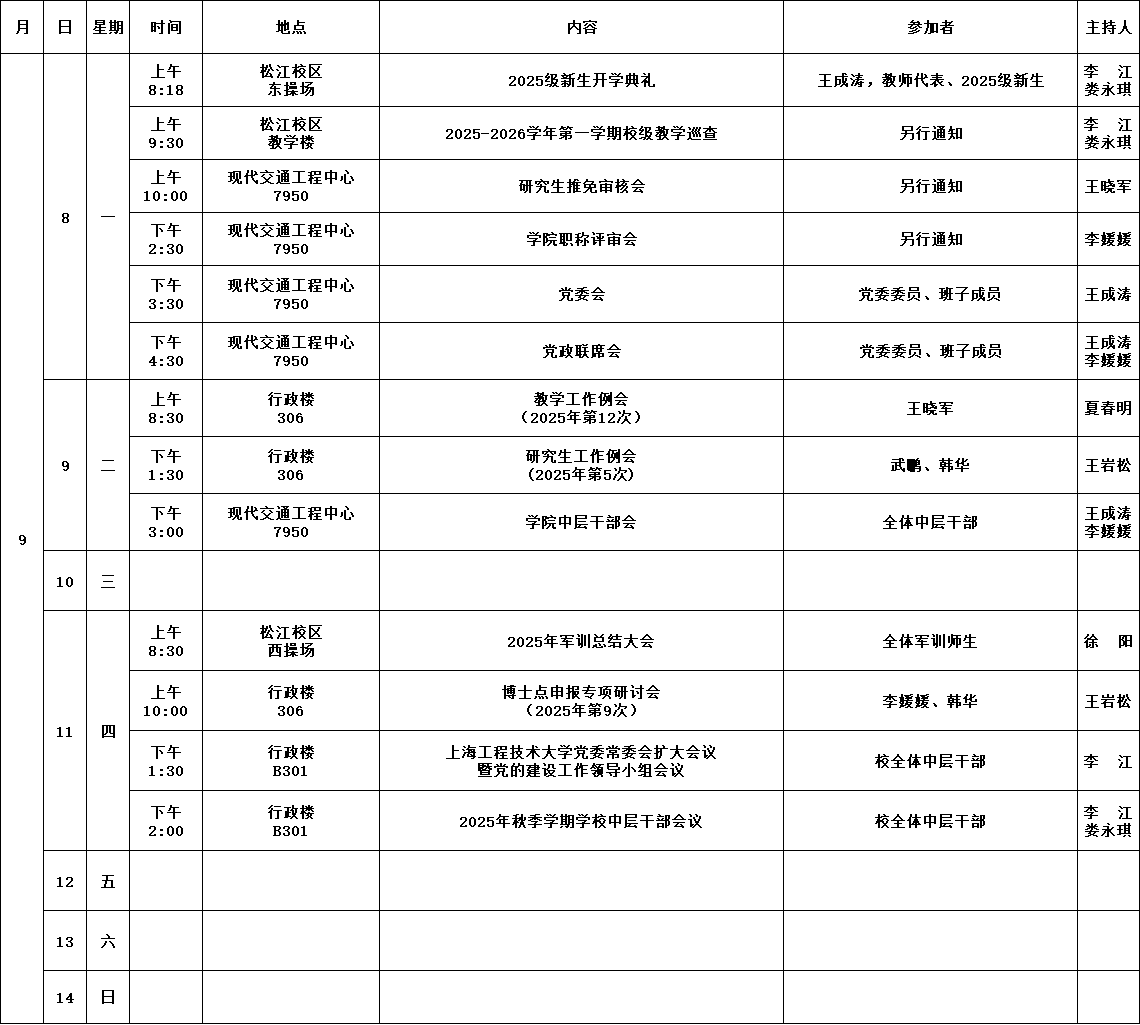 学院第1周活动安排(2025年9月8日-9月14日)