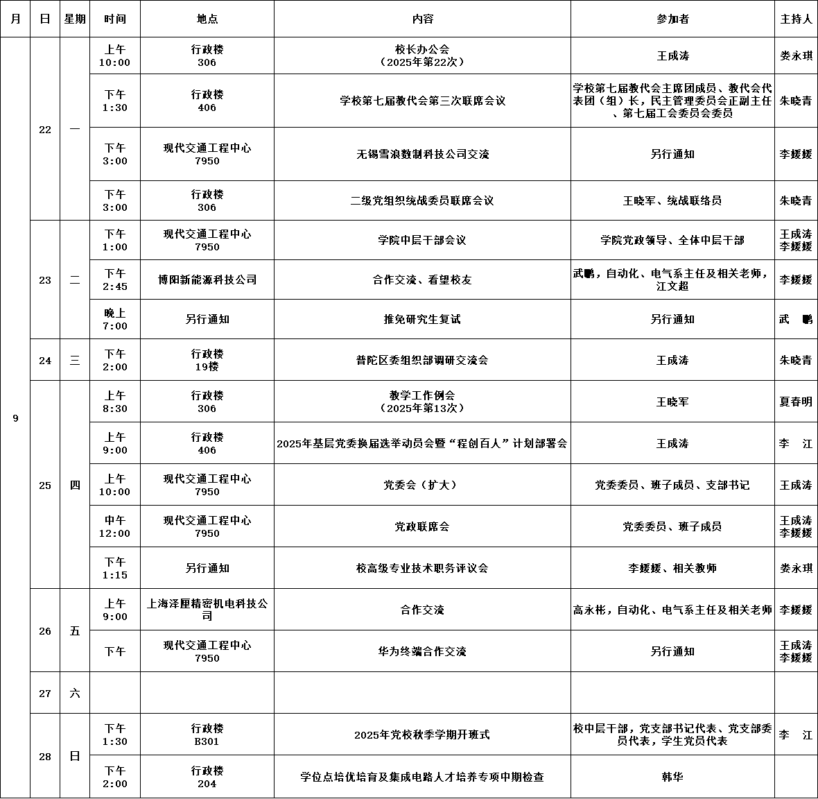 学院第3周活动安排(2025年9月22日-9月28日)