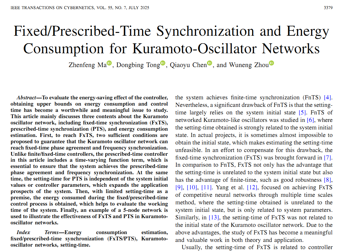 近期,bwin必赢童东兵教授指导硕士研究生马振峰在顶级期刊《IEEE Transactions on Cybernetics》,发表题为“Fixed/prescribed-time synchronization and energy consumption for Kuramoto-oscillator networks”的最新研究成果。该期刊是美国电气与电子工程师学会会刊,系国际自动化与控制系统领域中科院SCI一区顶级期刊,2025年影响因子为10.5。
