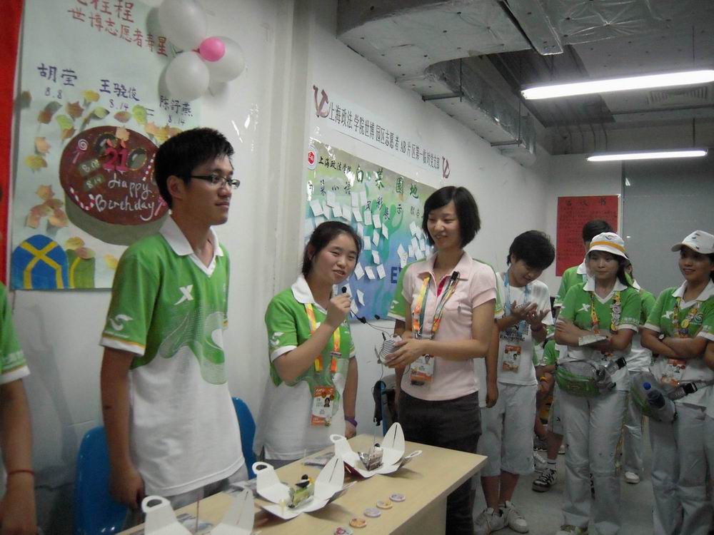 晚上离园之前,当工作了一天的志愿者们用几经波折借来的打火机为他们点燃了在园区临时买的生日蛋糕上的蜡烛后,刘婧峥老师和电气学院的小白菜们热情洋溢的为他们唱起生日歌曲,并送上了大家最诚挚的祝福。随后,三位小寿星各自许下自己的愿望并同时吹灭了生日蜡烛,刘老师和和大家在寿星们的脸上涂上充满爱心的颜料并共同合影,掌声、祝福声、欢笑声顿时响起,经久不息的回荡在世博园区里……