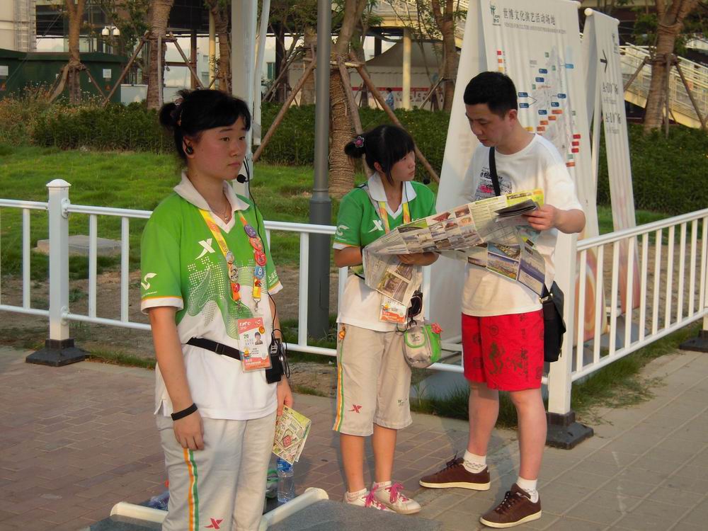 太阳如火如炉,气温节节攀升。小白菜们不畏高温日晒,坚守自己的岗位,电气女生志愿者更是巾帼不让须眉,玫瑰不让钢铁,表现出了她们刚毅的一面。 连日来烈日毫不留情地“烤”验着宋文婷、王亚同学,汗水争先恐后地跑出她们的体内。她们利用超强的忍耐力,发挥不怕苦不怕累的精神,坚守岗位,微笑服务八方来宾。随着周末假日的到来,进世博园参观的游客人数明显增加,小白菜们的工作量急剧上升。昔日里娇生惯养乖乖女,近日却是世博园里的耐火娃。宋文婷、王亚同学冒着酷暑,毫无怨言,竭诚尽力,服务游客。不信你向前问问看,无论你要去哪里她们都会用柔美的声音给你指示一条最为便捷的路线。在炙热的阳光下,她们仍继续绽放着阳光般的笑容,为游客们提供优质的服务。