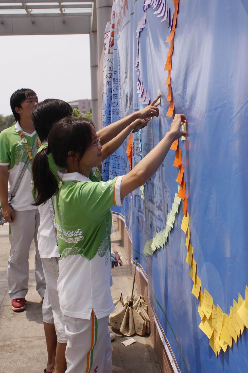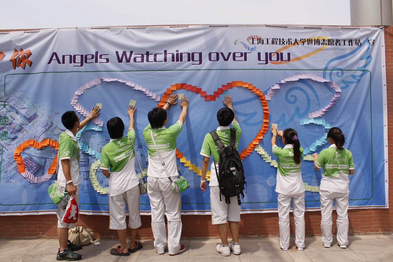 经过了多方准备,以及对志愿者祝福话语的收集, 守护天使活动是AB片区激励计划的重要环节,通过对志愿者随机配对,结成一对一的守护天使,即在AB片区448名志愿者中随机抽取224对互不相识的志愿者,他们彼此为对方的守护天使,每日可在天使墙上进行留言,互相勉励、互相鼓劲。天使墙为志愿者们搭建互动交流、同心协力的良好平台,让所有志愿者感觉到有一位天使守护身旁。 我们可以看到天使墙上巨大的“爱心天使”图案是由志愿者们用不同颜色便签纸写下寄语,粘贴而成的。每一张纸都承载了一位志愿者作为“天使”为他所守护的人带去的祝福,也承载着上海工程技术大学世博志愿者们团结一心、共同奋斗在世博志愿服务第一线的力量。