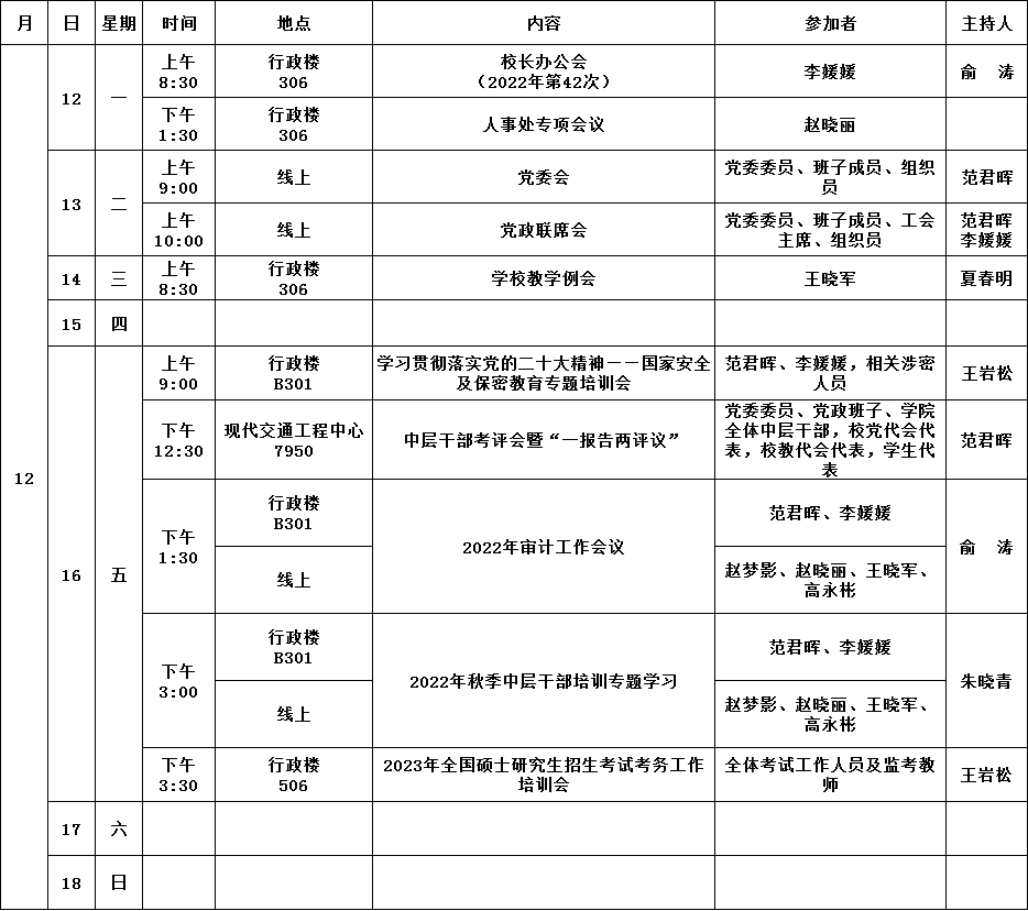 学院第15周活动安排(2022年12月12日-2022年12月18日)