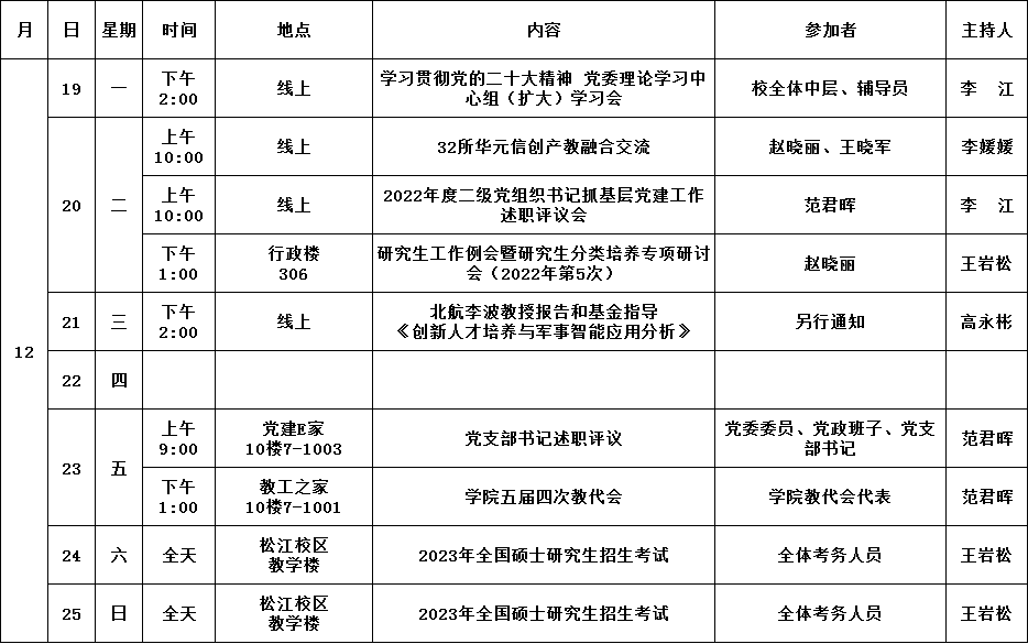 学院第16周活动安排(2022年12月19日-2022年12月25日)