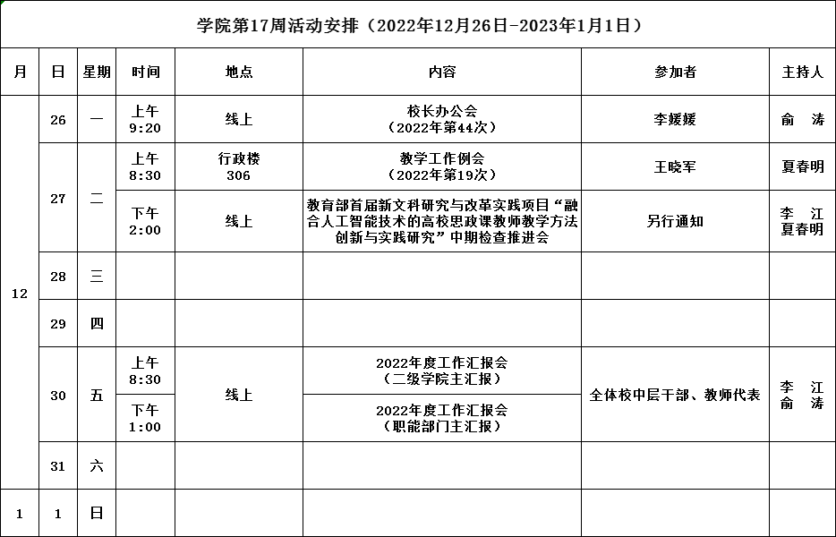 学院第17周活动安排(2022年12月26日-2023年1月1日)