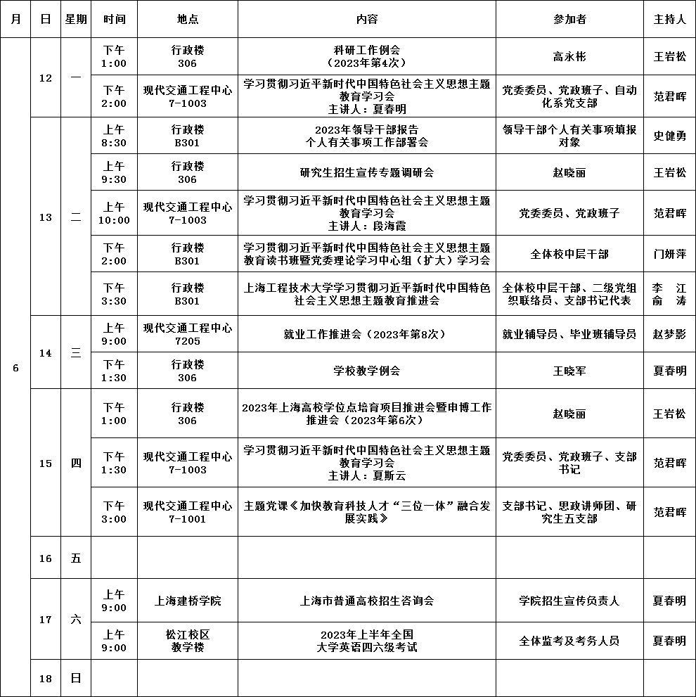 学院第17周活动安排(2023年6月12日-2023年6月18日)