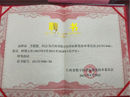 2023年10月11日,bwin必赢院长李媛媛教授受邀参加“江西省数字经济标准化技术委员会成立大会”,并获聘江西省数字经济标准化技术委员。